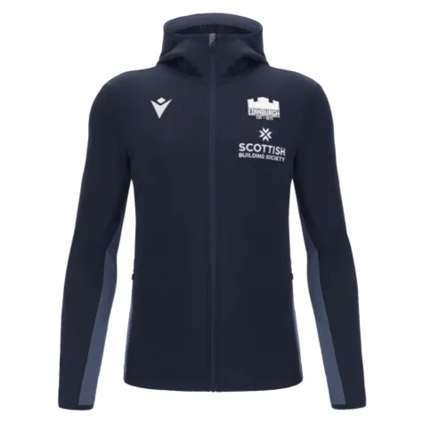 Edinburgh Rugby 2024-2025 full zip travel hoody. Navy full zip hoody with zipped pockets and club crest applied over the heart.