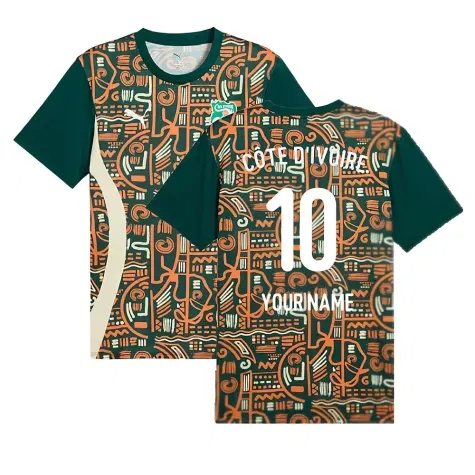 Official Your Name football shirt. This is the NEW Ivory Coast Prematch SS Jersey (Dark Myrtle) for the 2024-2025 season which is manufactured by Puma and is available in all Adult sizes.
