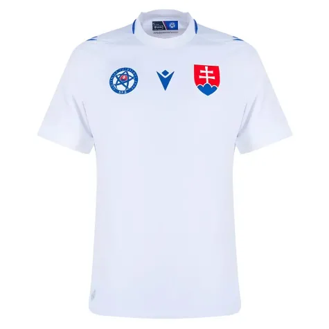Slovakia's 2024-2025 away shirt features a crisp white colourway with a tone-on-tone pattern throughout, contrasting the all-over falcon face pattern features across the sleeves. Completing the kit, Slovakia's flag colour, blue and red feature on the details, giving a clean design to the away jersey.
