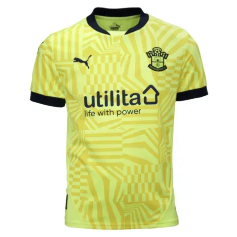 Stand out with the Southampton FC Away Kit, featuring a striking dazzle graphic on the front of the shirt and sleeves in fizzy yellow and yellow sizzle. The navy collar, cuffs, and shorts create a recognizable and classic color combination for the Saints.