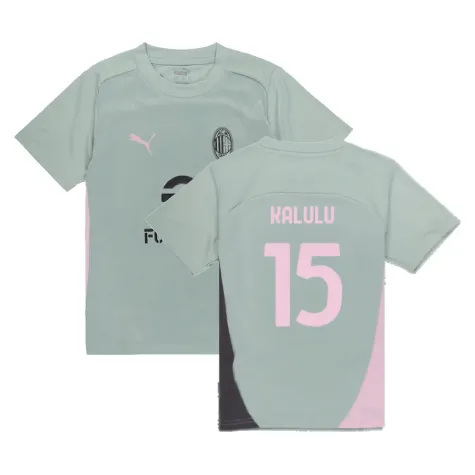 Official Pierre Kalulu football shirt. This is the NEW AC Milan Training Shirt (Green Fog) - Kids for the 2024-2025 season which is manufactured by Puma and is available in all Childrens sizes.