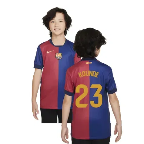Official Jules Kounde football shirt. This is the NEW Barcelona Home Shirt (Sponsorless) - Kids for the 2024-2025 season which is manufactured by Nike and is available in all Childrens sizes.