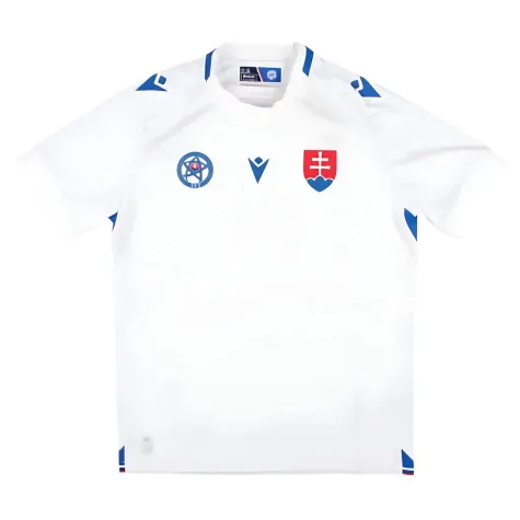 The Macron Slovakia 2024-2025 kids away shirt is white and has a knitted crew neck with blue details. The sleeves and shoulders are decorated with the embossed, tone-on-tone, stylized falcon motif.  The Slovak flag appears in dye-sub prints on both sides of the shirt bottom.