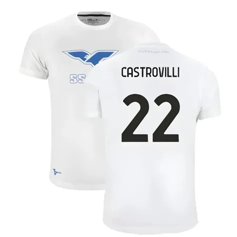 Official Gaetano Castrovilli football shirt. This is the NEW Lazio 125th Anniversary Cotton Tee (White) for the 2024-2025 season which is manufactured by Mizuno and is available in all Adult sizes.