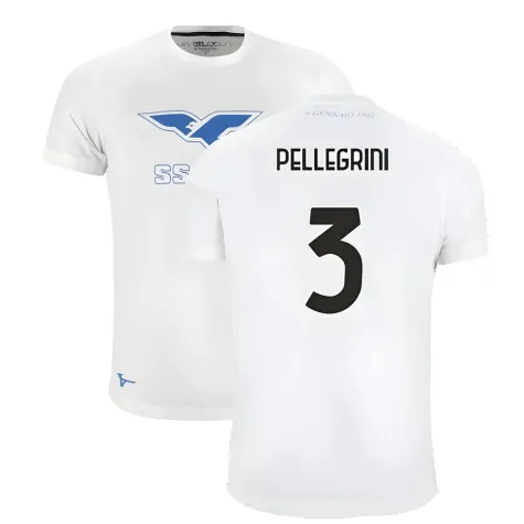 Official Luca Pellegrini football shirt. This is the NEW Lazio 125th Anniversary Cotton Tee (White) for the 2024-2025 season which is manufactured by Mizuno and is available in all Adult sizes.