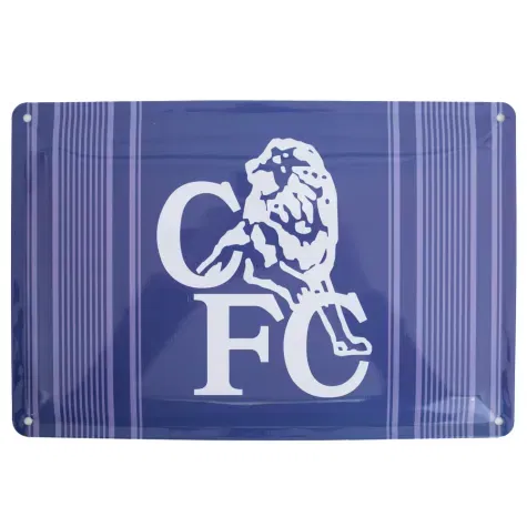 Blue metal tin sign featuring a retro Chelsea crest in the centre