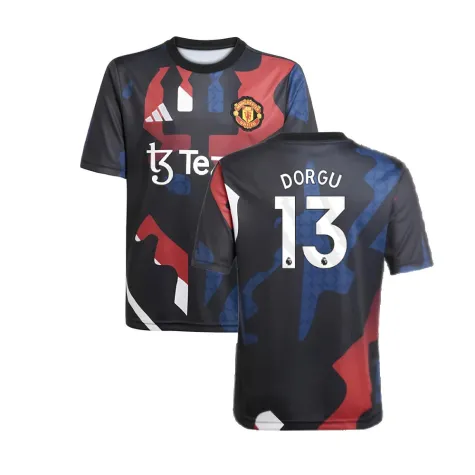 Official Patrick Dorgu football shirt. This is the NEW Man Utd Pre-Match Jersey (Black) - Kids for the 2024-2025 season which is manufactured by Adidas and is available in all Childrens sizes.