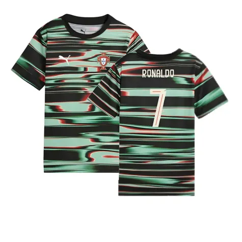 Official Cristiano Ronaldo football shirt. This is the NEW Portugal Prematch SS Jersey (Black) - Kids for the 2025-2026 season which is manufactured by Puma and is available in all Childrens sizes.