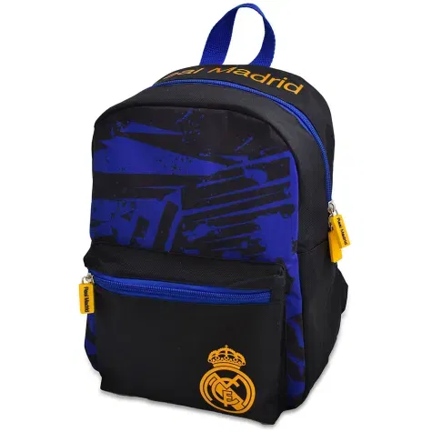 Black fragment design junior backpack featuring a gold Real Madrid crest