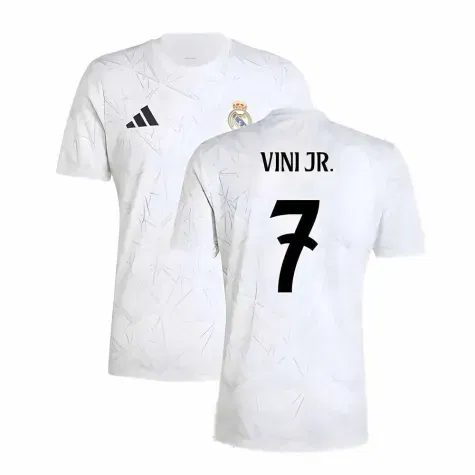 Official Vinicius Junior football shirt. This is the NEW Real Madrid Pre-Match Shirt (White) for the 2024-2025 season which is manufactured by Adidas and is available in all Adult sizes.