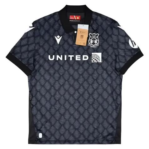 Wrexham's 2024-25 away shirt features a sleek black base with a dragon scale pattern embedded within the design. As the club reaches its 160th year, the button-up collar adds that retro feel as the monochrome crest stands out in a crisp white