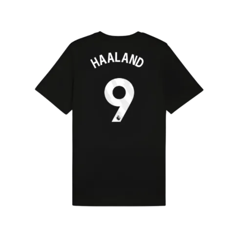Official Erling Haaland football shirt. This is the NEW Man City FtblESS Tee (Black) for the 2025-2026 season which is manufactured by Puma and is available in all Adult sizes.