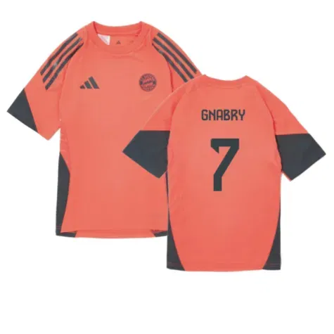 Official Serge Gnabry football shirt. This is the NEW Bayern Munich Training Shirt (Easy Coral) - Kids for the 2025-2026 season which is manufactured by Adidas and is available in all Childrens sizes.