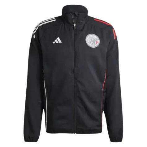 The Ajax 2025-2026 training collection features black, red, and white, the colours of the city and in honour of Amsterdams 750th anniversary. The classic Ajax logo also returns, forever. The jacket features a high neck, full zip, and two zippered pockets. The adidas detailing is red on one side and white on the other.