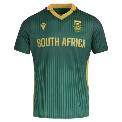 The Macron Proteas Cricket Replica Jersey is a high-performance, officially licensed kit designed for passionate fans of South Africa's national cricket team. Crafted from lightweight, breathable fabric, this jersey ensures comfort and mobility, whether you're cheering from the stands or playing your own match. The jersey features the iconic green and gold colours, reflecting the team's proud heritage.