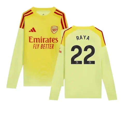 Official David Raya football shirt. This is the NEW Arsenal Home Goalkeeper Shirt (Yellow) - Kids for the 2025-2026 season which is manufactured by Adidas and is available in all Childrens sizes.