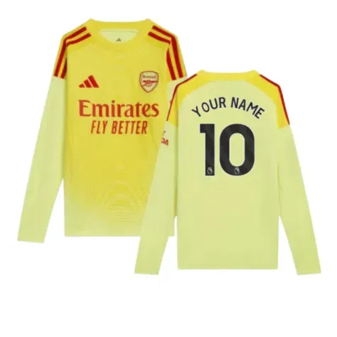Official Your Name football shirt. This is the NEW Arsenal Home Goalkeeper Shirt (Yellow) - Kids for the 2025-2026 season which is manufactured by Adidas and is available in all Childrens sizes.