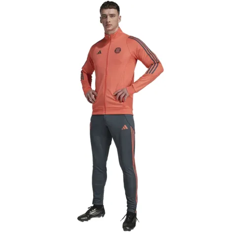 Train like champions with the official Bayern Munich 2025-2026 Adidas Tracksuit in standout Easy Coral. This coordinated set includes a lightweight zip-up jacket and tapered training pants, both designed with Adidas AEROREADY technology to manage moisture and maximise comfort. The jacket features the club crest and 3-Stripes detailing, while the pants offer an adjustable waistband and zippered ankles for easy wear. Whether you are warming up, travelling, or repping the Bavarian giants casually, this tracksuit combines performance, style, and club pride effortlessly.
