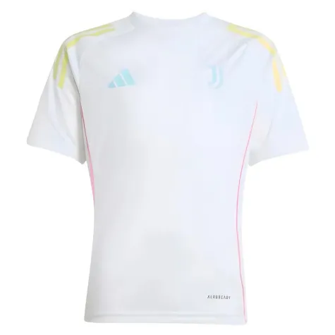 Let young fans train like champions with the Juventus 2025-2026 Adidas Training Shirt in White. This lightweight and breathable shirt is built with AEROREADY technology to keep kids cool and dry, whether theyre on the pitch or at play. Featuring a sleek all-white design with subtle neon yellow shoulder accents, pastel blue Adidas and Juventus logos, and pink piping down the sides, it blends high-performance comfort with standout style. Perfect for training sessions or casual wear, its the ultimate choice for future Bianconeri stars.