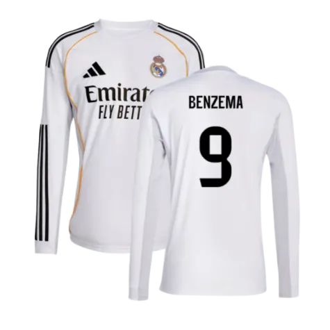Official Karim Benzema football shirt. This is the NEW Real Madrid Long Sleeve Home Shirt for the 2025-2026 season which is manufactured by Adidas and is available in all Adult sizes.