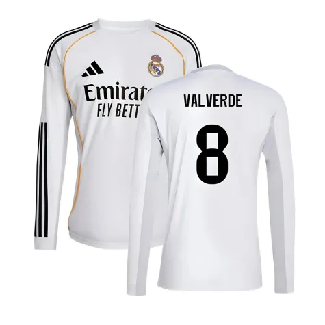 Official Federico Valverde football shirt. This is the NEW Real Madrid Long Sleeve Home Shirt for the 2025-2026 season which is manufactured by Adidas and is available in all Adult sizes.