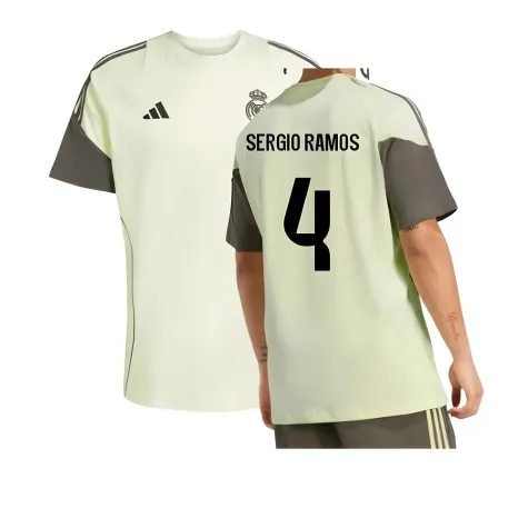 Official Sergio Ramos football shirt. This is the NEW Real Madrid Training Tee (Almost Lime) for the 2025-2026 season which is manufactured by Adidas and is available in all Adult sizes.