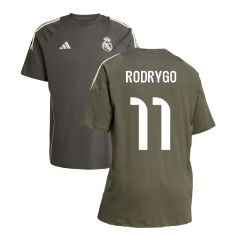 Official Rodrygo football shirt. This is the NEW Real Madrid Training Tee (Utility Grey) for the 2025-2026 season which is manufactured by Adidas and is available in all Adult sizes.