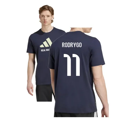 Official Rodrygo football shirt. This is the NEW Real Madrid Seasonal Graphic Tee (Legend Ink) for the 2025-2026 season which is manufactured by Adidas and is available in all Adult sizes.
