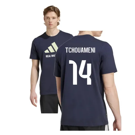 Official Aurelien Tchouameni football shirt. This is the NEW Real Madrid Seasonal Graphic Tee (Legend Ink) for the 2025-2026 season which is manufactured by Adidas and is available in all Adult sizes.