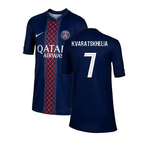 Official Khvicha Kvaratskhelia football shirt. This is the NEW PSG Paris Saint Germain Home Shirt (Kids) for the 2025-2026 season which is manufactured by Nike and is available in all Childrens sizes.