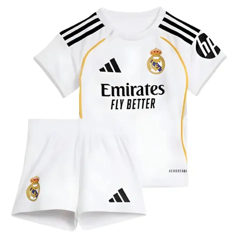 Dress your little champion in the iconic colors of the most successful club in football history. This adorable Real Madrid Home Baby Kit brings the magic of the Santiago Bernabu straight to your nursery, featuring the famous all-white design that has witnessed countless victories and legendary moments.
