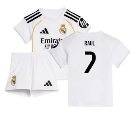 Official Raul football shirt. This is the NEW Real Madrid Home Baby Kit for the 2025-2026 season which is manufactured by Adidas and is available in all Childrens sizes.