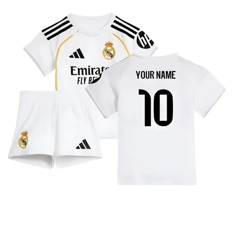 Official Your Name football shirt. This is the NEW Real Madrid Home Baby Kit for the 2025-2026 season which is manufactured by Adidas and is available in all Childrens sizes.