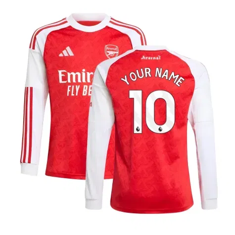 Official Your Name football shirt. This is the NEW Arsenal Long Sleeve Home Shirt (Kids) for the 2025-2026 season which is manufactured by Adidas and is available in all Childrens sizes.