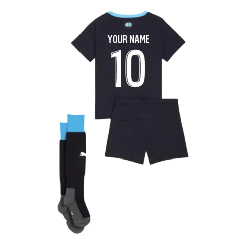 Official Your Name football shirt. This is the NEW Marseille Away Mini Kit for the 2025-2026 season which is manufactured by Puma and is available in all Childrens sizes.