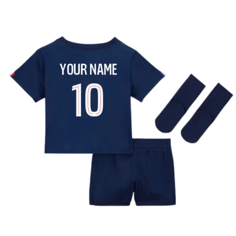 Official Your Name football shirt. This is the NEW PSG Home Baby Kit for the 2025-2026 season which is manufactured by Nike and is available in all Childrens sizes.