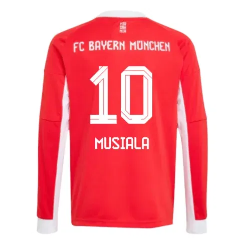 Official Jamal Musiala football shirt. This is the NEW Bayern Munich Long Sleeve Home Shirt (Kids) for the 2025-2026 season which is manufactured by Adidas and is available in all Childrens sizes.