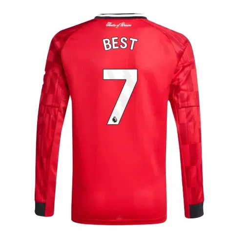 Official George Best football shirt. This is the NEW Man Utd Long Sleeve Home Shirt (Kids) for the 2025-2026 season which is manufactured by Adidas and is available in all Childrens sizes.