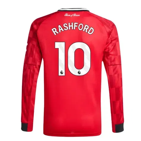 Official Marcus Rashford football shirt. This is the NEW Man Utd Long Sleeve Home Shirt (Kids) for the 2025-2026 season which is manufactured by Adidas and is available in all Childrens sizes.