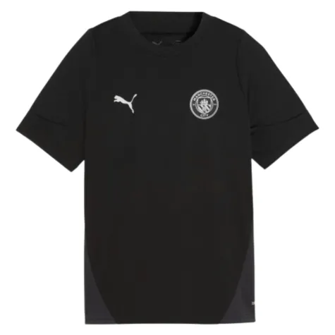 Featuring a sleek black base with subtle silver accents, this training jersey blends performance tech with a sharp, modern design. The iconic Manchester City crest and Puma logo are proudly displayed on the chest, giving it a bold, official look.