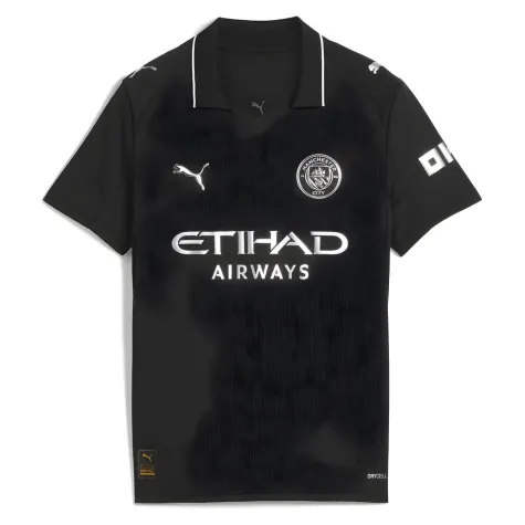 The Kids' Manchester City Away Jersey 2025/26 beautifully blends the clubs rich heritage with modern performance. Inspired by Manchester Citys origins in Gorton, the 25/26 Away Kit reimagines the clubs first-known kit from 1884 with a bold all-black design and metallic detailing that brings the past into the present. This jersey is a tribute to the first Cityzens. Built for comfort and performance, it features dryCELL sweat-wicking technology and breathable mesh panels on the sides and underarms to keep your kid cool and dry. The regular fit and short sleeves provide all-day comfort, while the official Manchester City crest and PUMA Cat logos complete the look. Timeless, minimalist and powerful, this is the new Manchester City Away Jersey for kids.