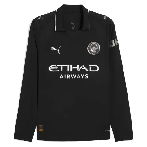 Experience the same shirt worn by Pep Guardiola's squad with this authentic long-sleeve Manchester City away shirt. The 2025-26 away kit features a striking black base with vibrant sky blue and white accents, creating a bold and modern look that pays homage to the club's identity.