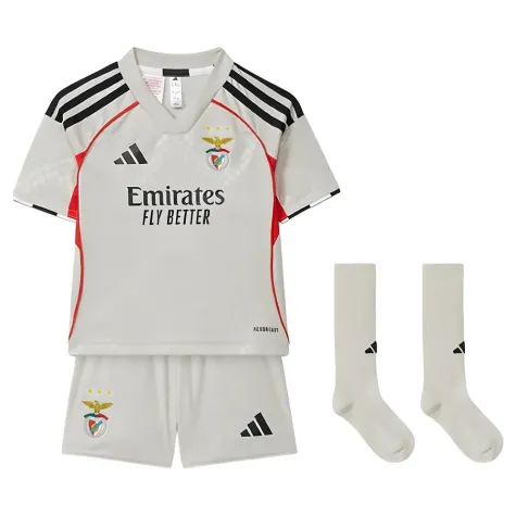 The kit features Benfica's classic away colourway with modern Adidas performance technology scaled down for junior fans. Made from lightweight, breathable fabric, it ensures comfort whether they're playing in the garden or cheering from the stands at Estdio da Luz.