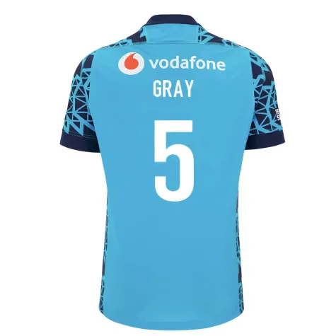 Official Jonny Gray football shirt. This is the NEW Scotland Rugby Training Jersey (Navy-Sky) - Kids for the 2025-2026 season which is manufactured by Macron and is available in all Childrens sizes.