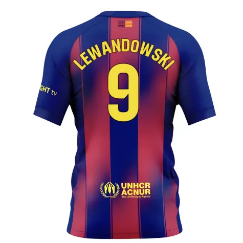 Official Robert Lewandowski football shirt. This is the NEW Barcelona Home Shirt (Kids) for the 2025-2026 season which is manufactured by Nike and is available in all Childrens sizes.