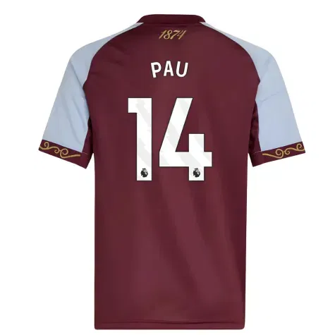 Official Pau Torres football shirt. This is the NEW Aston Villa Home Shirt for the 2025-2026 season which is manufactured by Adidas and is available in all Childrens sizes.