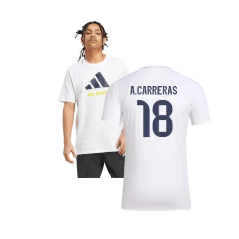 Official Alvaro Carreras football shirt. This is the NEW Real Madrid Seasonal Graphic Tee (White) for the 2025-2026 season which is manufactured by Adidas and is available in all Adult sizes.