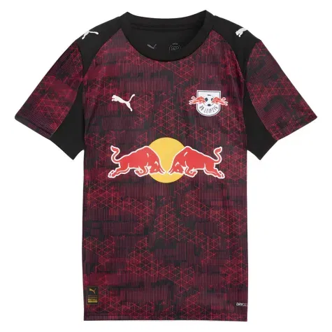 Let your young Red Bull Leipzig fan showcase their team pride with this striking 2025-2026 third shirt. Featuring a bold black base with a distinctive red and dark pattern incorporating pixelated elements and angular digital motifs for a tech-inspired aesthetic, this kit represents the cutting-edge spirit that defines RB Leipzig.