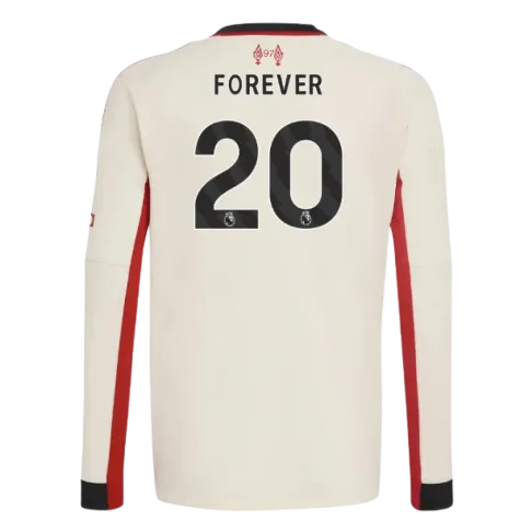 Official Forever 20 football shirt. This is the NEW Liverpool Away Long Sleeve Shirt (Kids) for the 2025-2026 season which is manufactured by Adidas and is available in all Childrens sizes.