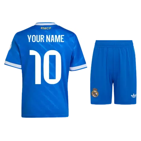 Official Your Name football shirt. This is the NEW Real Madrid Third Mini Kit for the 2025-2026 season which is manufactured by Adidas and is available in all Childrens sizes.